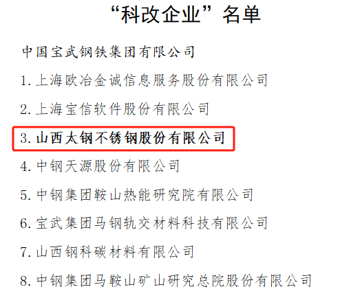 山西太鋼不銹鋼股份有限公司入選最新“科改企業”名單
