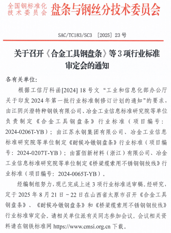 2025年8月4日,由由富佰新材料(浙江)有限公司、冶金工業(yè)信息標(biāo)準(zhǔn)研究院等單位制定《橋梁纜索用不銹鋼鋼絞線(xiàn)》等3項(xiàng)行業(yè)標(biāo)準(zhǔn)已完成標(biāo)準(zhǔn)送審稿,將于2025年8月21日-22日在山西省太原市召開(kāi)業(yè)標(biāo)準(zhǔn)審定會(huì)。